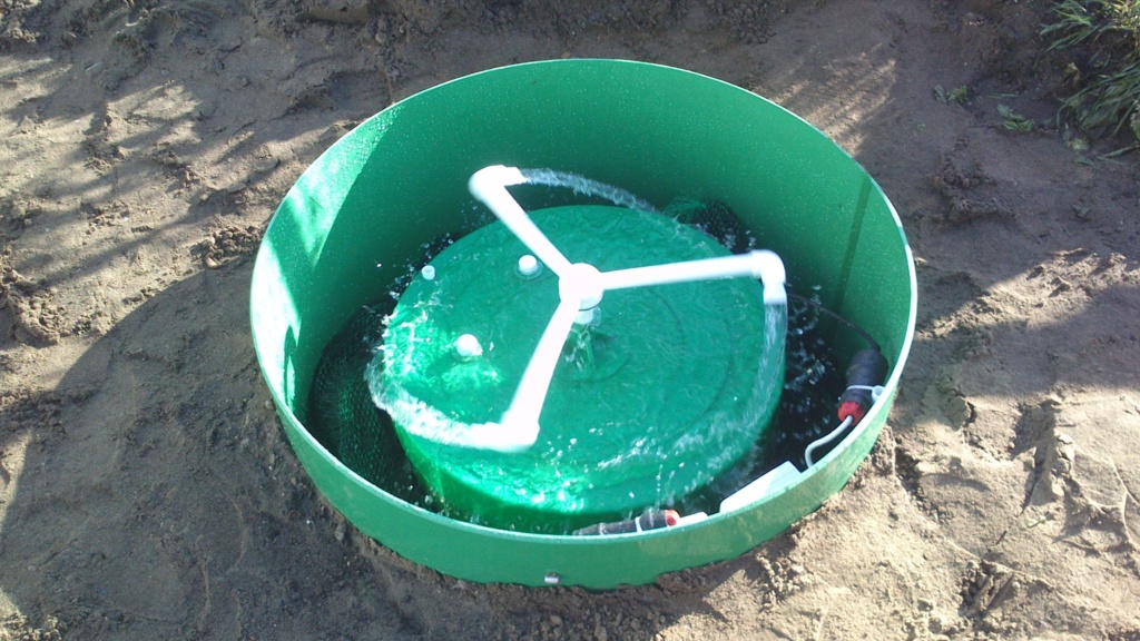 2. Второй этап – доочистка в биофильтре. Из третьей камеры отстойника осветленные сточные воды при помощи дренажного насоса, управляемого электронным блоком, перекачиваются в верхнюю часть септика и через вращающийся распылитель равномерно разбрызгиваются по всей площади биозагрузки (биофильтра). Фильтр является местом обитания микроорганизмов. В момент разбрызгивания сточные воды насыщаются кислородом и фильтруются через загрузочный материал. Включение циркуляционного насоса происходит по заданию блока управления, расположенного в биореакторе Alta Bio. Далее часть вод, насыщенных биоорганизмами, возвращается в первую камеру, что позволяет ускорить процесс разложения и осаждения взвешенных частиц и обеспечивает усреднение поступающих на очистку сточных вод. Микроорганизмы ускоряют процессы разложения биомассы, после чего происходит окисление веществ, содержащих азот, до нитратов и нитритов с последующим выделением газообразного азота в первой камере станции. Основной объем очищенной воды возвращается в третью камеру.