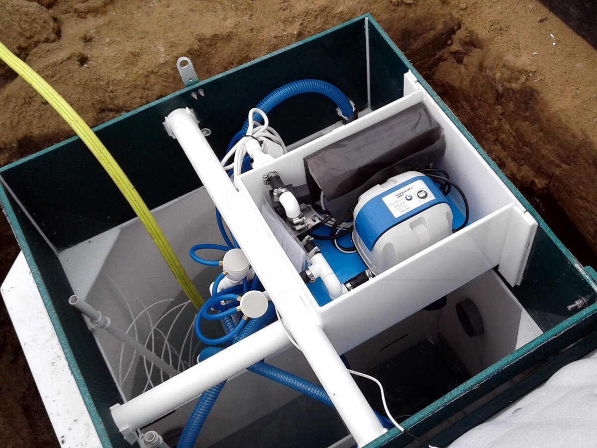- Врезка и герметизация швов патрубков подводящего и отводящего. Присоединение подводящего и отводящего трубопроводов, дренажного насоса для отвода чистой воды (если предусмотрено комплектацией).